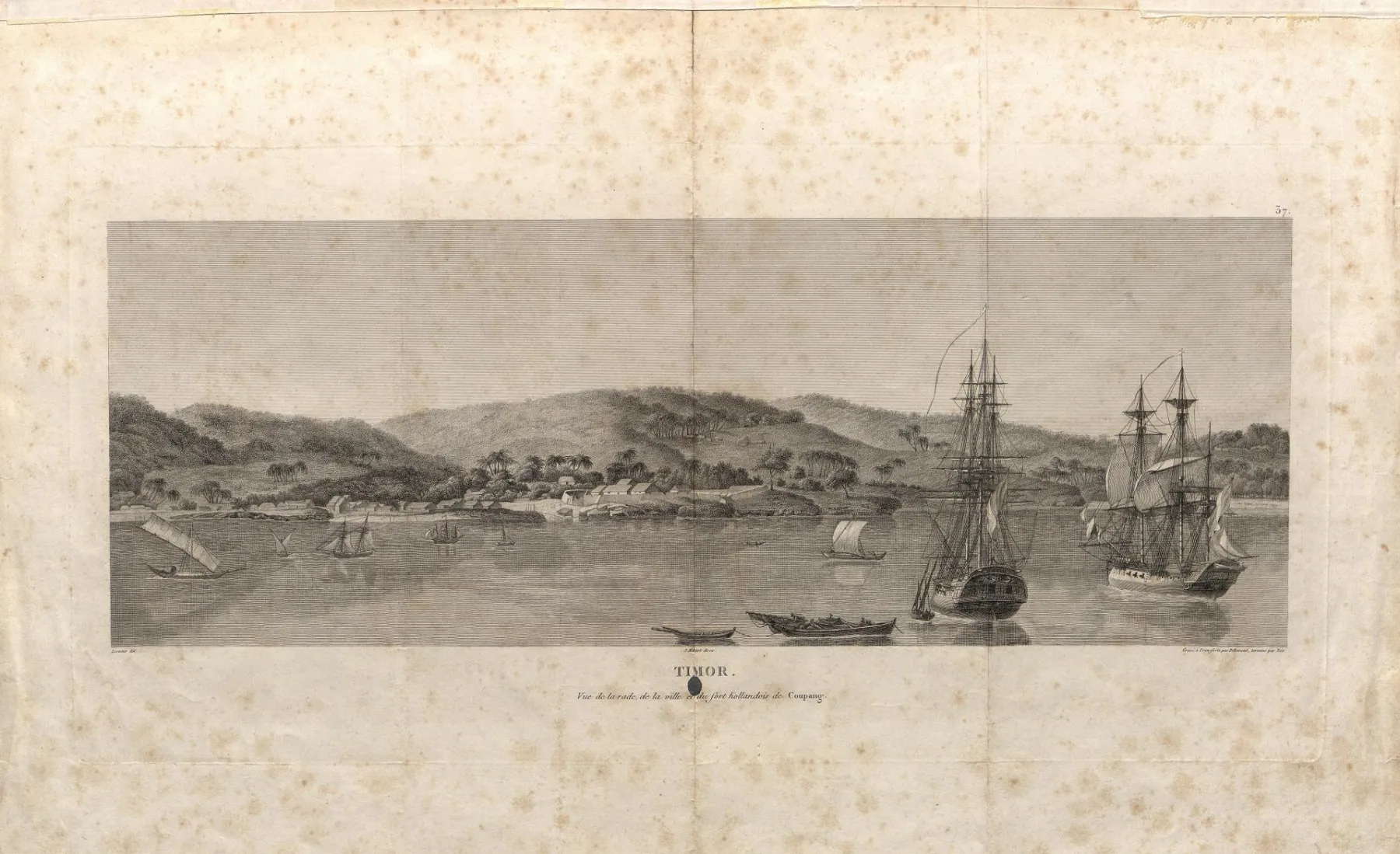 La relâche à Timor est longue, dictée par le mauvais état des bateaux et la santé chancelante des hommes. L’expédition est bien accueillie par le gouverneur hollandais à la Baie de Coupang, une ville peu étendue. La nature généreuse contraste avec les côtes occidentales australiennes. Mais le climat humide est difficile à supporter, le scorbut et la dysenterie continuent de faire rage.