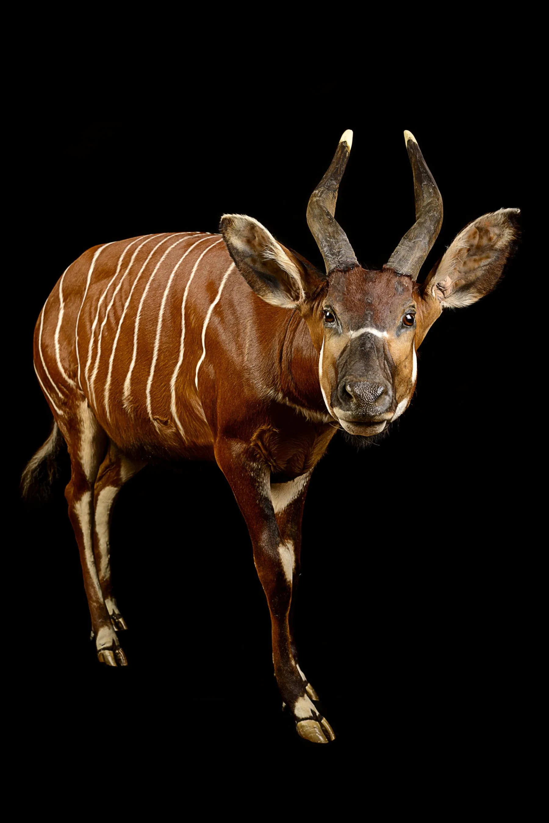 Animaux très discrets, ils sont actifs de jour comme de nuit. Durant la journée, ils se camouflent dans des buissons et petits arbustes, dont ils ne sortent qu’à la nuit tombée. Leurs grandes cornes en spirale peuvent mesurer jusqu’à un mètre de long ! Il y a quelques décennies encore, le bongo était abondamment chassé pour sa peau – et même pour sa viande ! Il subit également la destruction de son habitat. Il a ainsi déjà complètement disparu d’Ouganda.