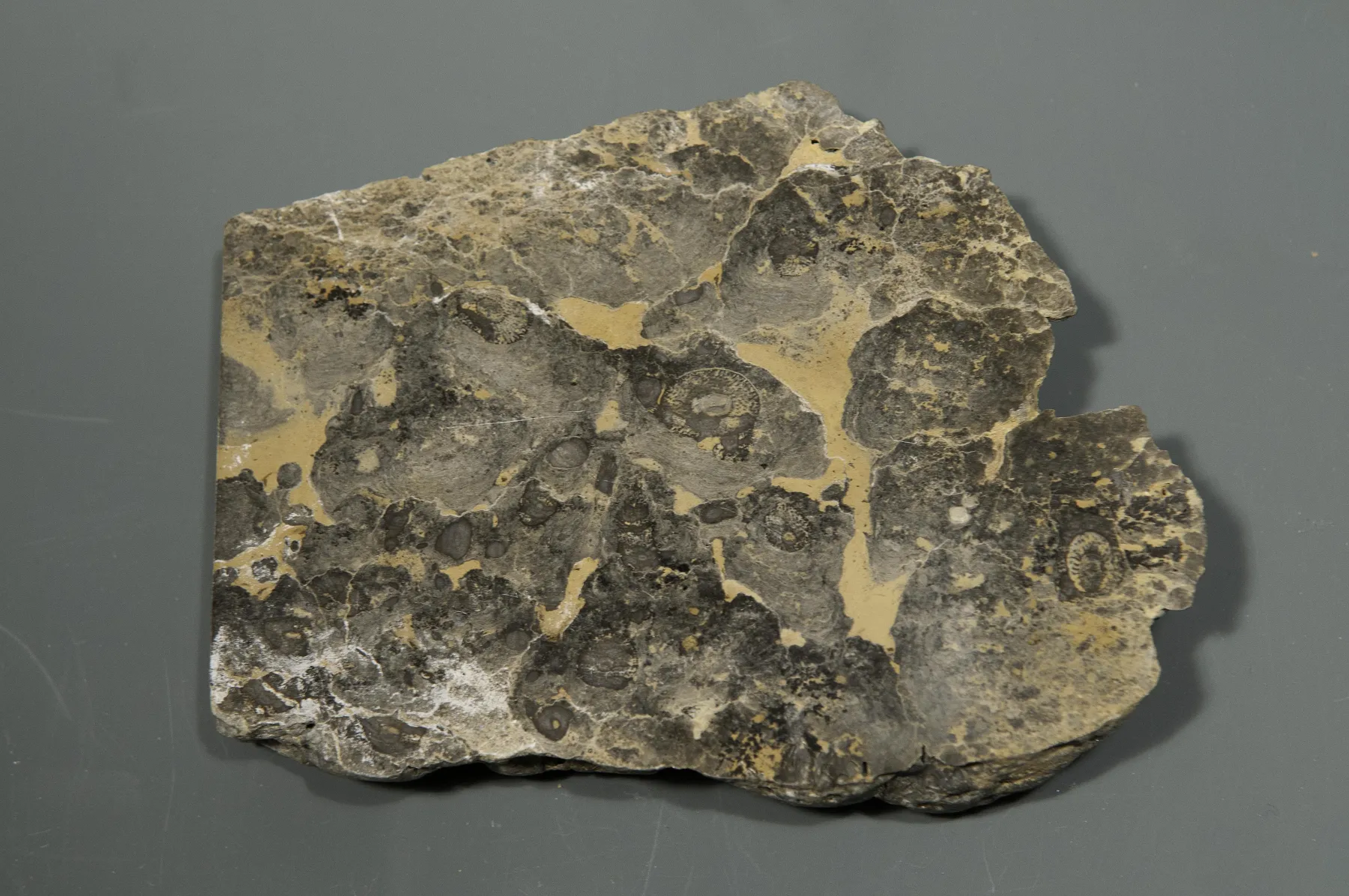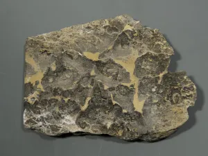 L’échantillon présenté ici est un stromatolithe scié et poli afin de mieux étudier sa structure interne. Il provient de Barneville-Carteret et indique par sa présence que le Cotentin était recouvert d’une mer peu profonde à l’époque du Cambrien, il y a environ 500 millions d’années. Il existe aujourd’hui encore des colonies de Cyanobactéries créant des récifs de stromatolithes. Citons par exemple la colonie que l’on trouve dans le parc national de Yalgorup en Australie.