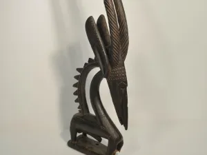 Ces cimiers étaient des objets fédérateurs et protecteurs pour la communauté et sortaient en couple : les mâles, comme celui-ci, ont une crinière, les femelles n’en ont pas et portent un petit sur le dos.