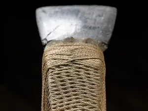 Pour cet objet, les matériaux utilisés et le travail d’assemblage revêtent une importance symbolique. Les lames de pierre faisaient l’objet d’échanges, et étaient généralement intégrées à des outils de travail. Ici en revanche, la pierre n’est pas destinée à être tranchante, mais peut représenter un refuge, un lieu de présence pour une divinité — par exemple Tane, le dieu des sculpteurs sur bois et des charpentiers. Le travail des fibres de cocotier (production et tressage) était traditionnellement une activité rituelle, réservée à un spécialiste. Plusieurs types de tressage et d’assemblage de ces fibres se retrouvent sur ce même objet, marque de sa valeur.