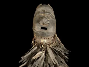 Dans le nord de la Grande Terre, ce masque était porté lors de la cérémonie de deuil et personnifiait le chef décédé, l’ancêtre fondateur du clan ou l’esprit qui guide les morts vers l’autre monde. Le porteur du masque voyait à travers les dents espacées de la bouche. Les cheveux qui entrent dans sa composition sont ceux des deuilleurs, personnes proches du disparu. Les plumes proviennent de plusieurs oiseaux, dont le notou, sorte de grand pigeon.