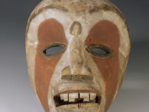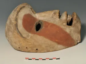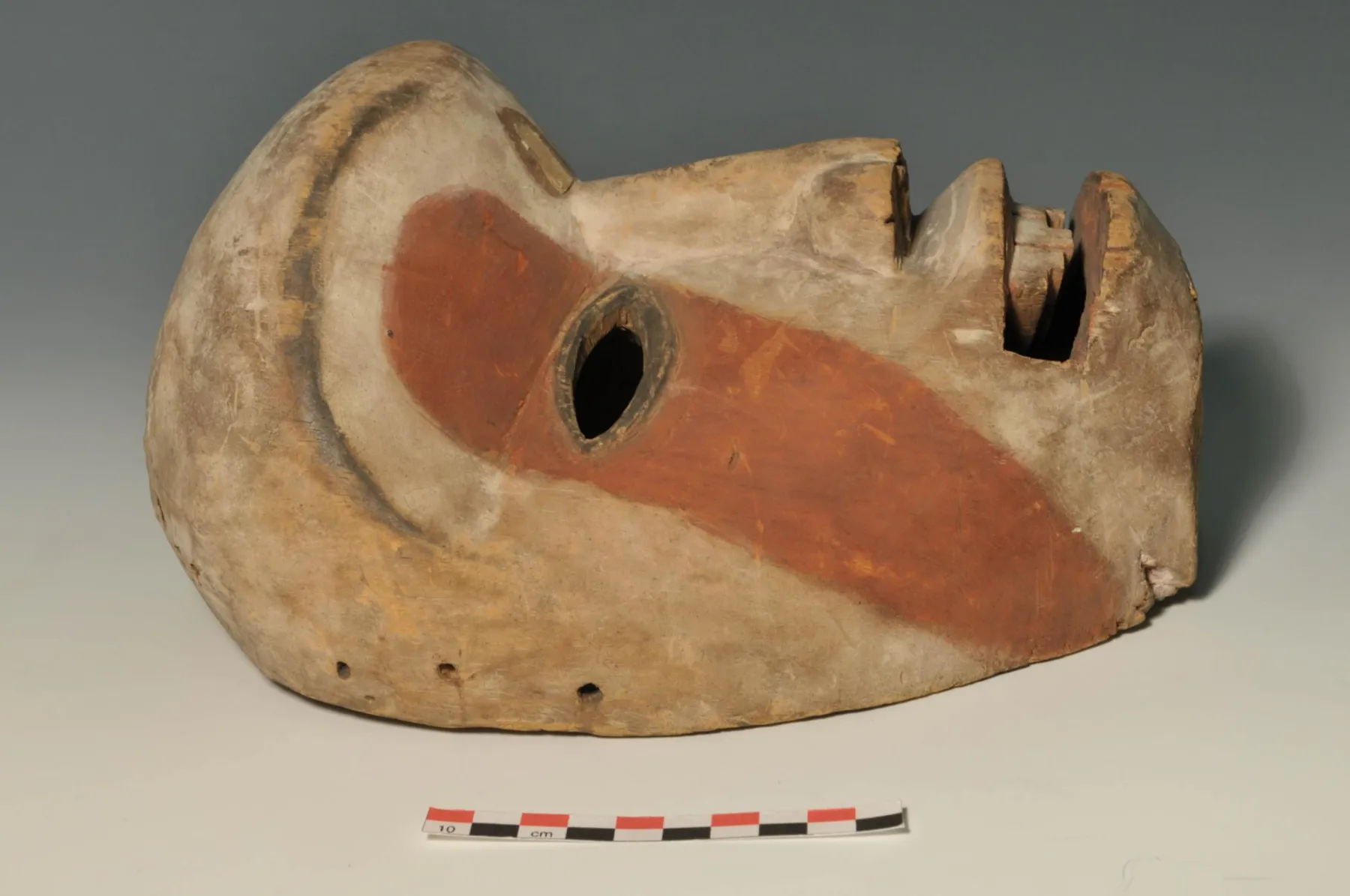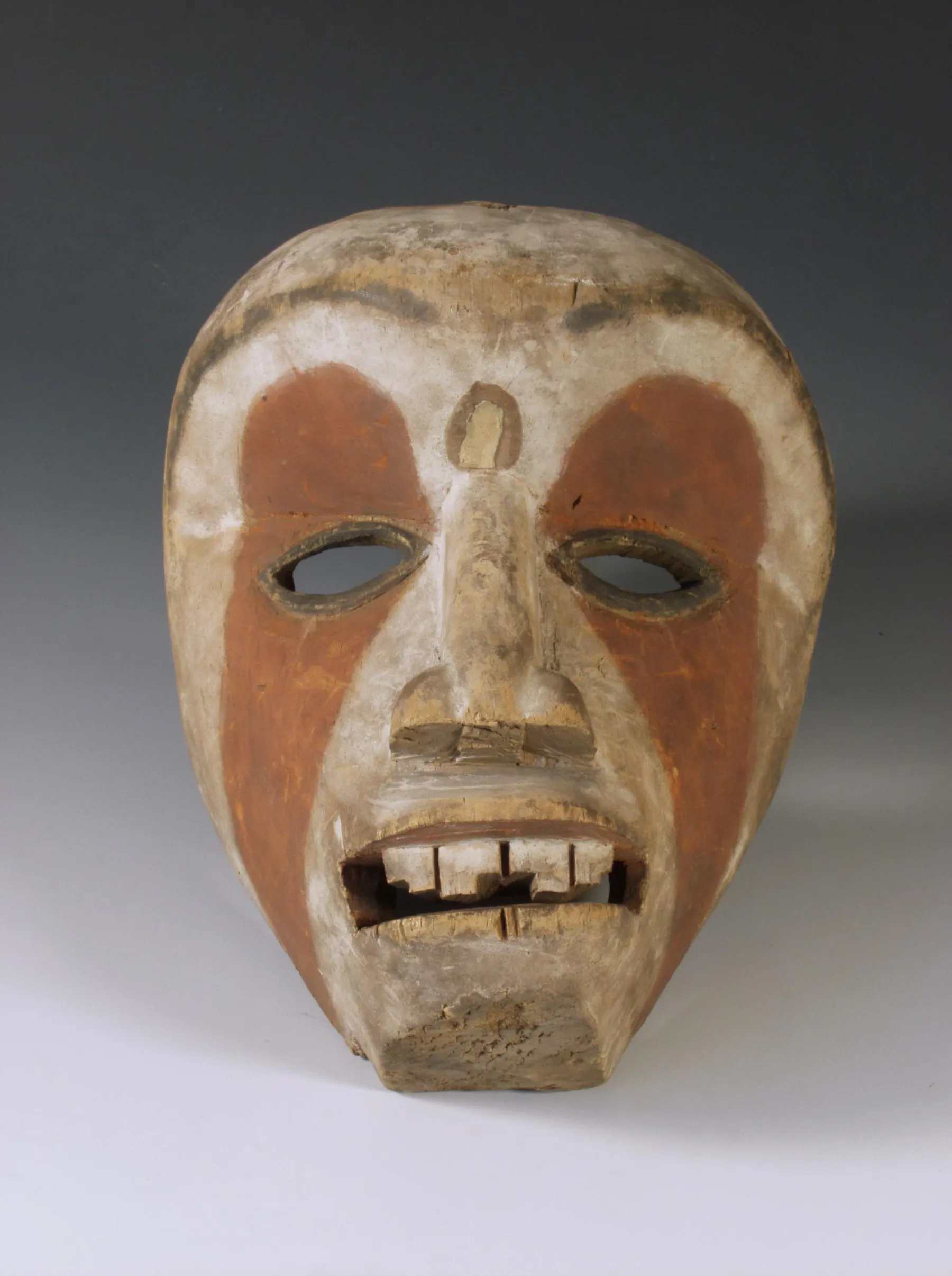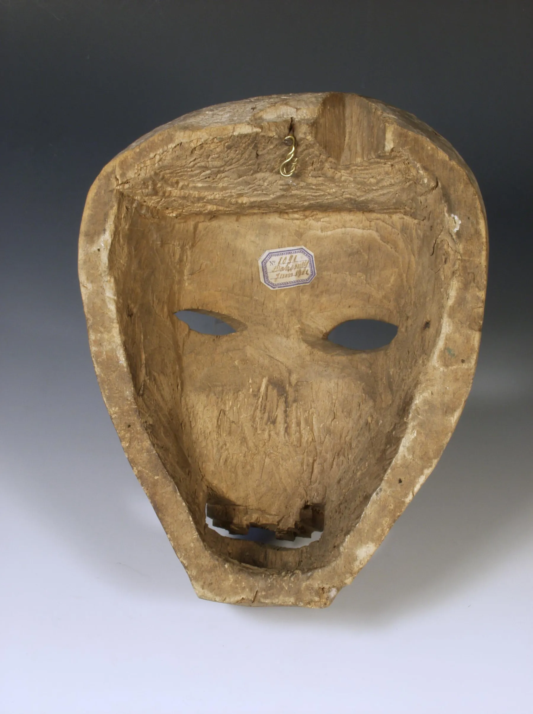 Le porteur du masque était de plus habillé d’un encombrant costume de feuilles de bananier, autrefois de plumes, accompagné d’objets illustrant son nom. Sans son costume ni la mémoire de son proverbe, ce masque a perdu son identité.