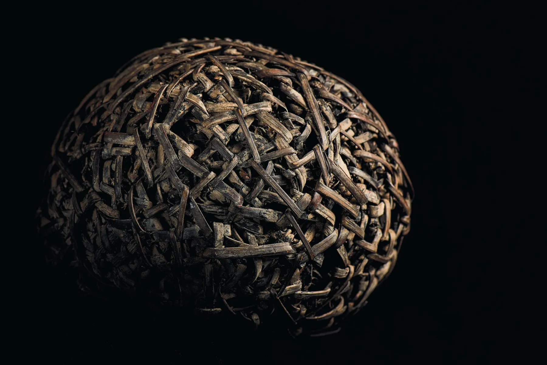 Ce nkisi mbumba, objet magique manipulé par un devin, se présente sous la forme d’un panier végétal contenant un crâne de singe enserré dans une gangue argileuse.