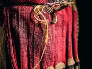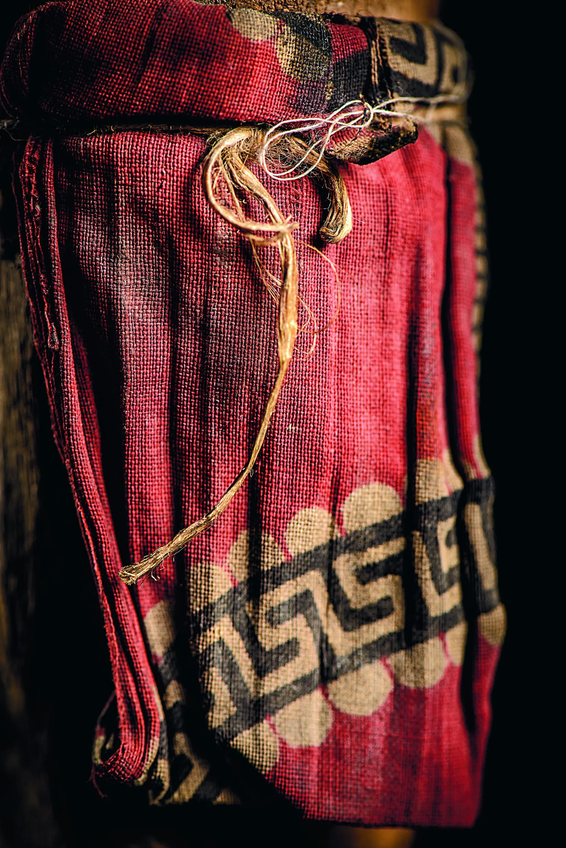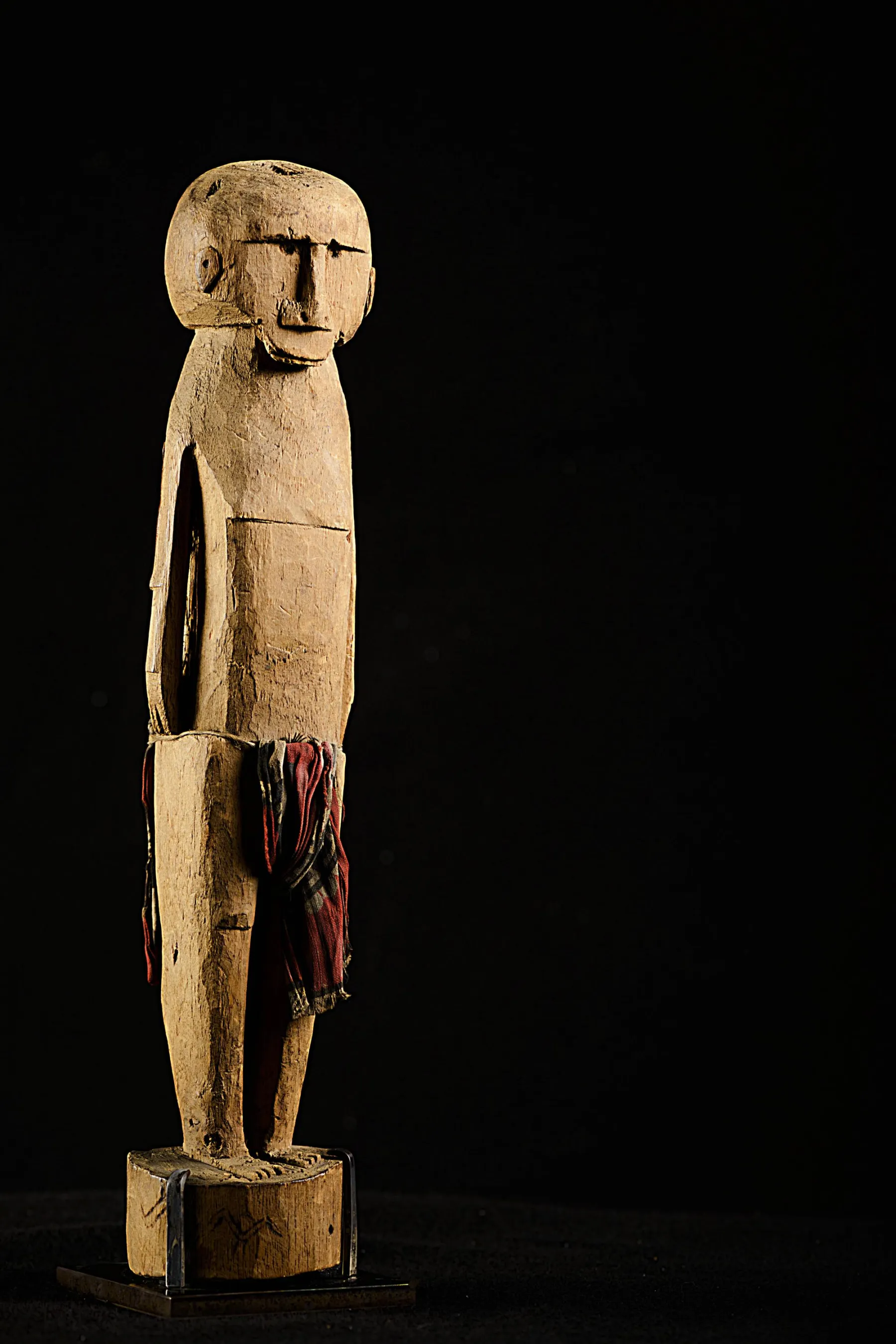 Sculptée dans un seul morceau de bois clair et léger, cette statuette présente des formes stylisées. Ses bras sont collés au corps, et les détails (mains, pieds, oreilles) sont simplement soulignés par des incisions. Elle porte un pagne en tissu d’importation imprimé et coloré, décoré de motifs géométriques.