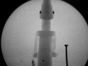 Si la plupart des statuettes Teke, appelées butti, sont engoncées du cou aux pieds dans une gangue de terre contenant des charges magiques, celle-ci possède seulement deux « médecines ». L’une d’entre elles contient une petite bille métallique, aperçue lors de la radiographie.