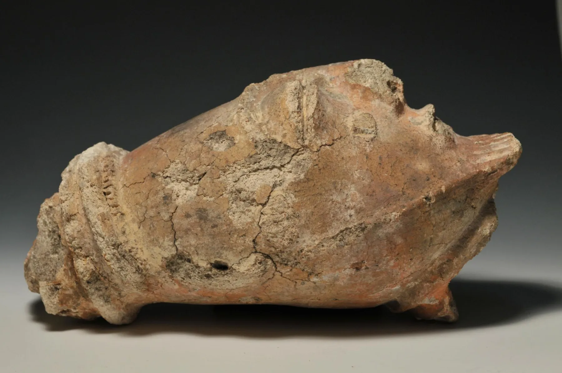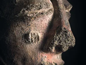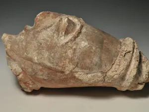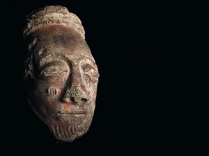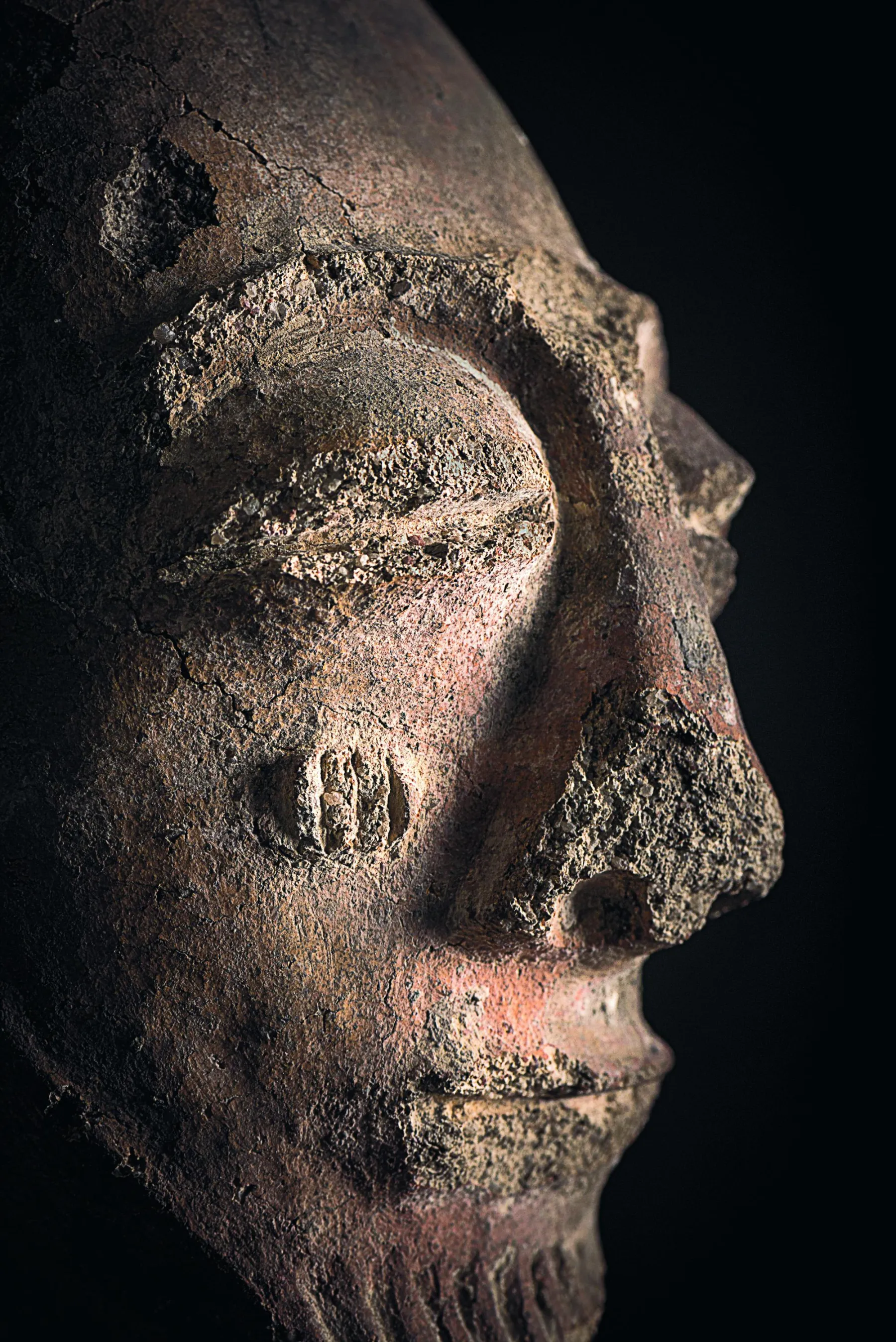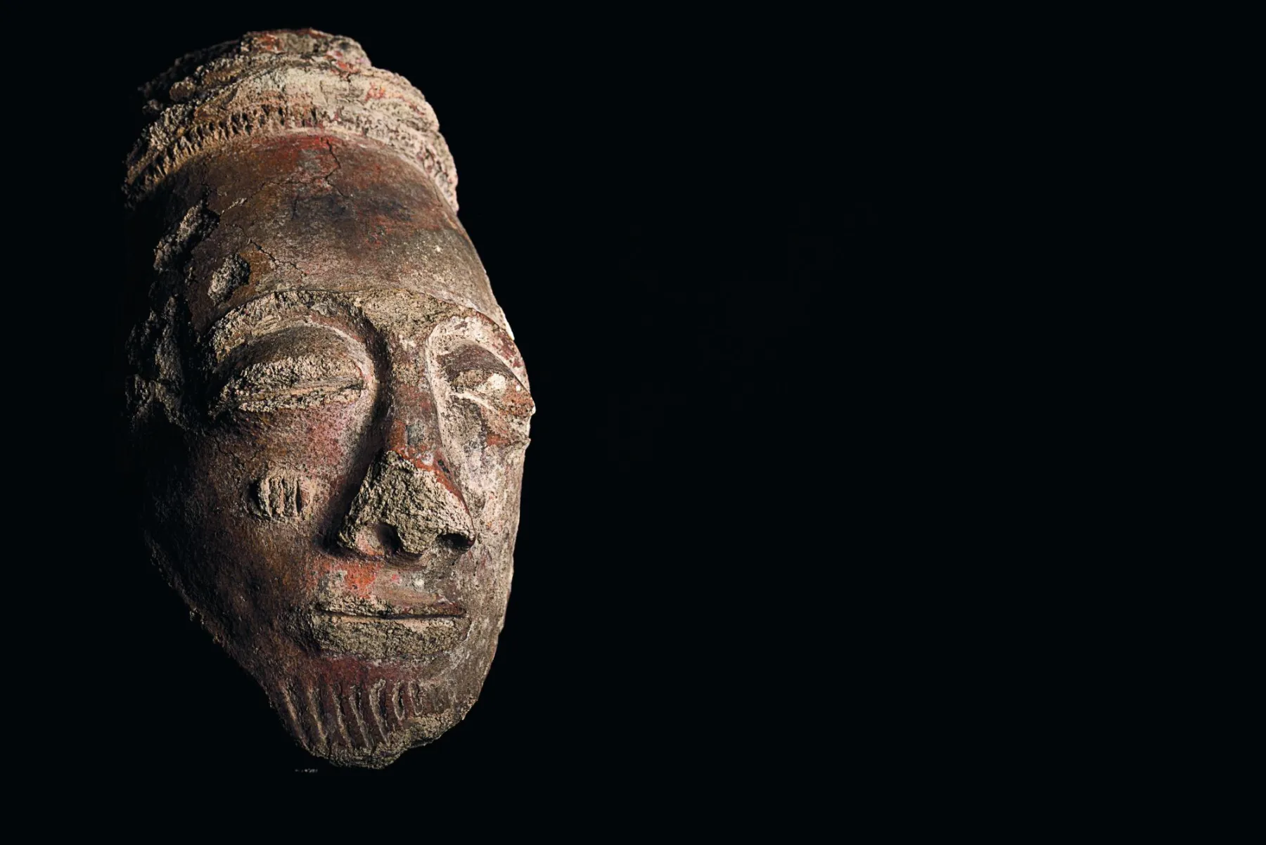 Cette tête en terre cuite est une statuette funéraire appelée mma.