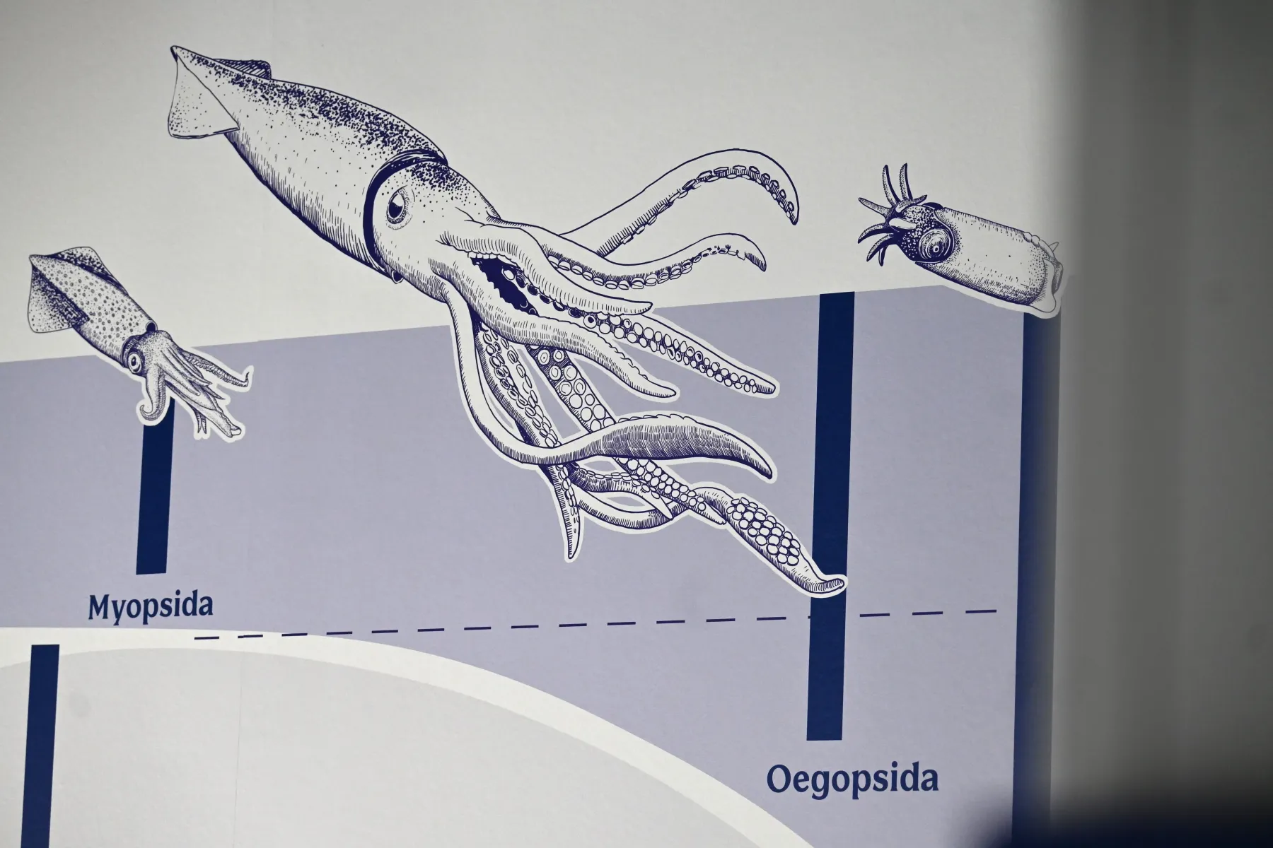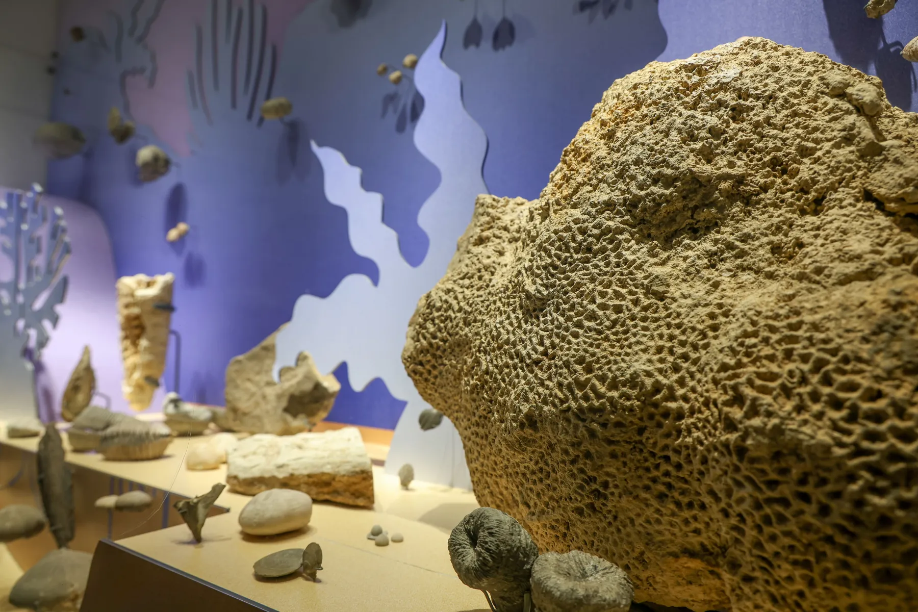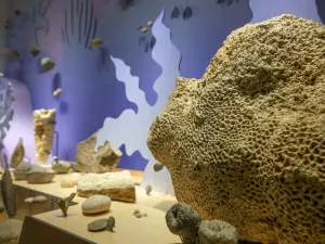 Des fossiles bien conservés, principalement issus des falaises du Cap de la Hève, illustrent la richesse des mers chaudes, des rivages anciens et des forêts du Mésozoïque. Parmi les pièces phares : le squelette reconstitué du Loricatosaurus priscus (dinosaure cuirassé de la famille des stégosaures), un mur d’ammonites retraçant l’histoire des céphalopodes, et un récif foisonnant de coraux et coquillages fossilisés.