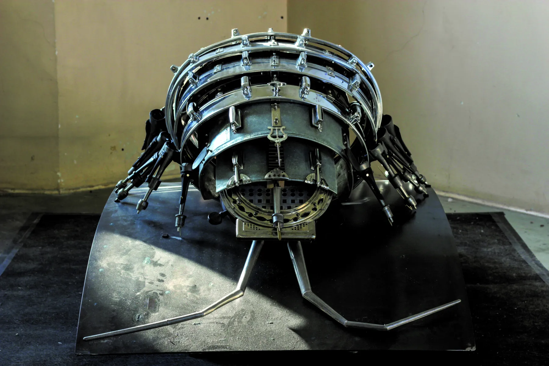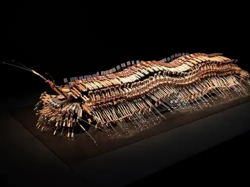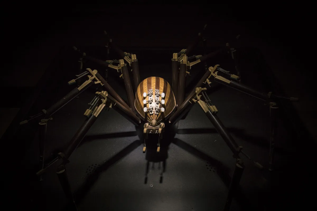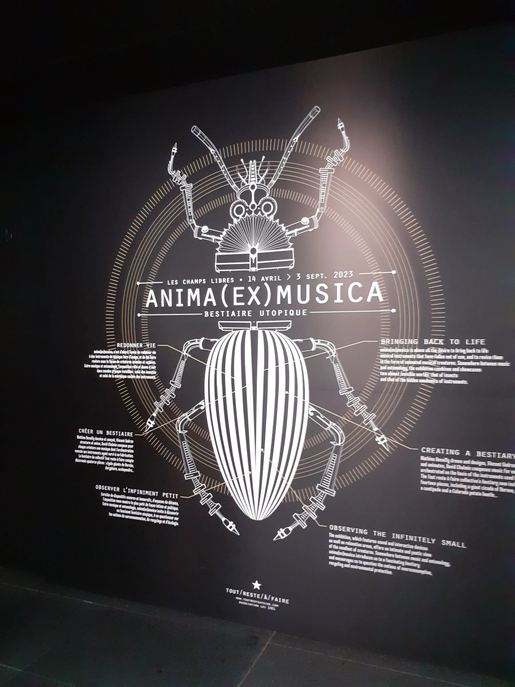 Pour l’exposition Anima (Ex) Musica, le collectif Tout Reste à Faire a rassemblé des instruments hors d’usages pour fabriquer des structures imposantes. Violons, guitares, clavecins, harmonicas et autres sources de son sont ainsi assemblées pour former des sculptures d’arthropodes, (insectes et crustacés) géants. Dans les couloirs des Champs Libres de Rennes, la mécanique reflète l’organique le temps d’une exposition.