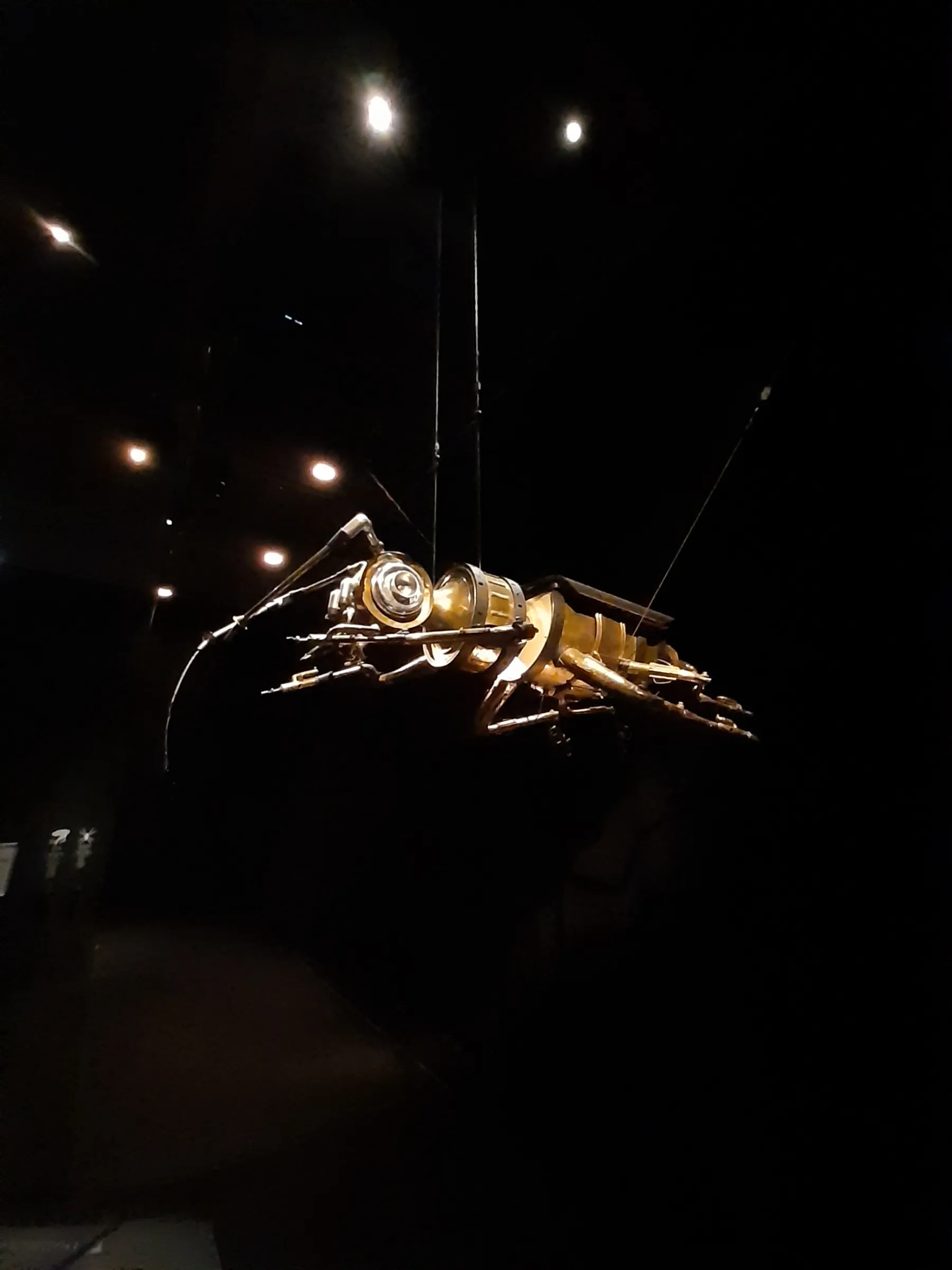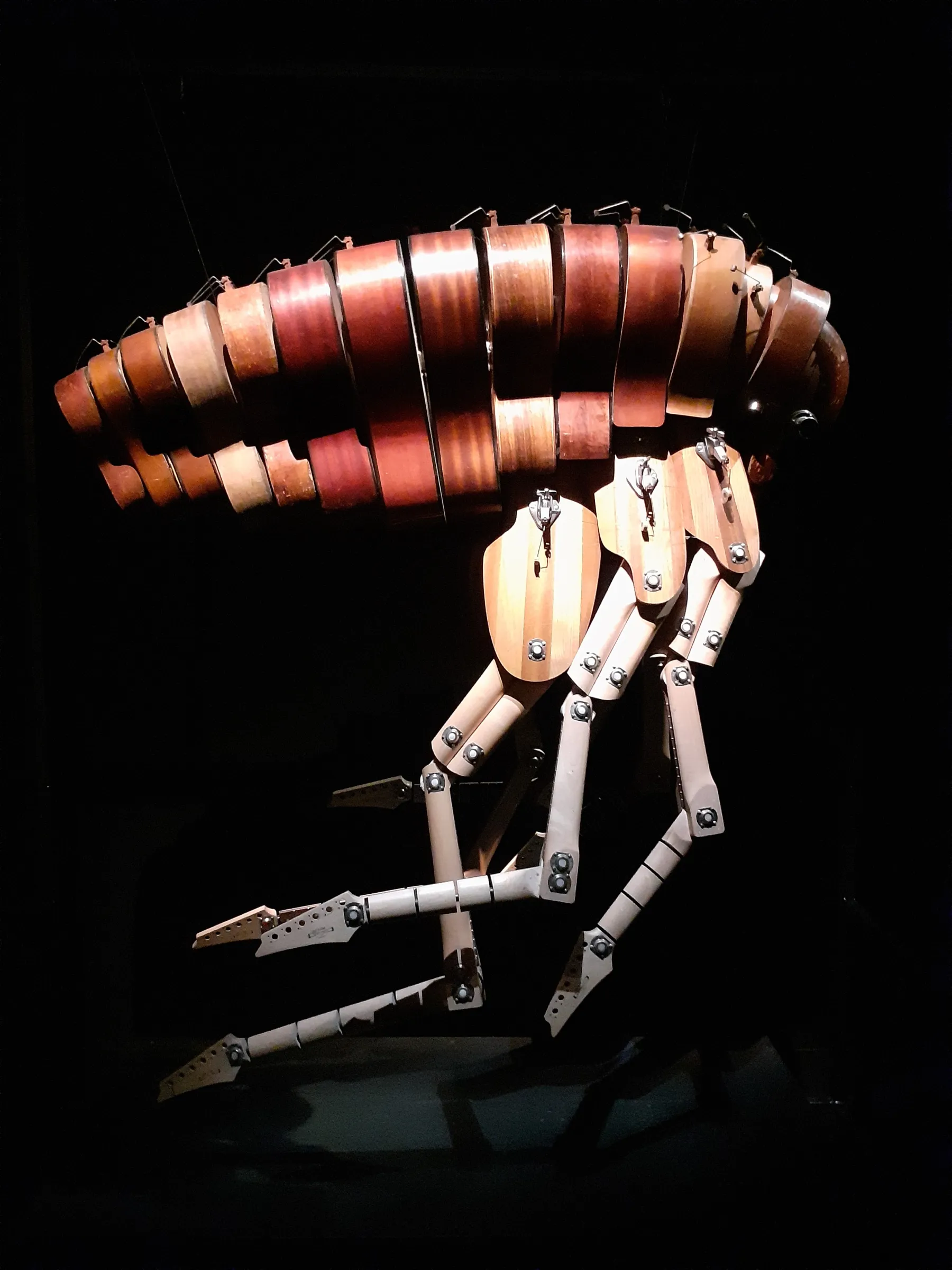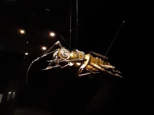 Face à nous, un bestiaire musical plus vrai que nature composée d’insectes à l’apparence cyberpunk. Parmi ces créations sonores issues du recyclage, vous pourrez découvrir 2 pianos droits formant une sauterelle, une scolopendre fait d’assortiments de pianos, mandolines chinoises, accordéons, violoncelles et grelots à clochette, et d’autres créatures dont on peut retrouver les plans ici. Au total, 15 êtres faits de bois et de métal s’animent en musique sous les yeux des visiteur.euse.s émerveillé.e.s (ou apeuré.e. s).