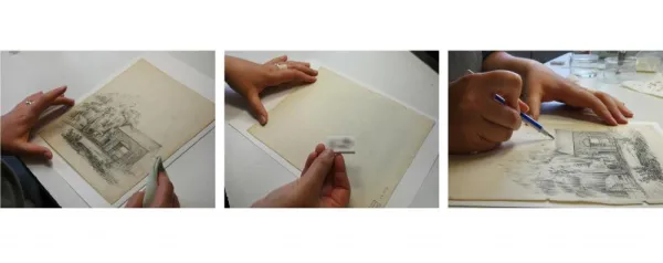 À l’aide d’une brosse douce, d'un chiffon microfibre et d’une gomme, le papier est dans un premier temps nettoyé de la poussière accumulée et les matériaux acides éliminés.