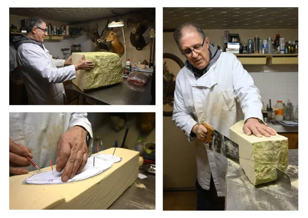 Une fois les mesures faites et pendant que le cuir travaille, je réalise ensuite le mannequin. Pour ma part, j’utilise de la mousse polyuréthane. Cette matière est plus résistante et plus facile à travailler que les anciennes structures faites de bois et de paille. Comme un sculpteur, on sculpte le corps de l’animal directement dans la matière, qu’on peut scier, tailler, modeler…