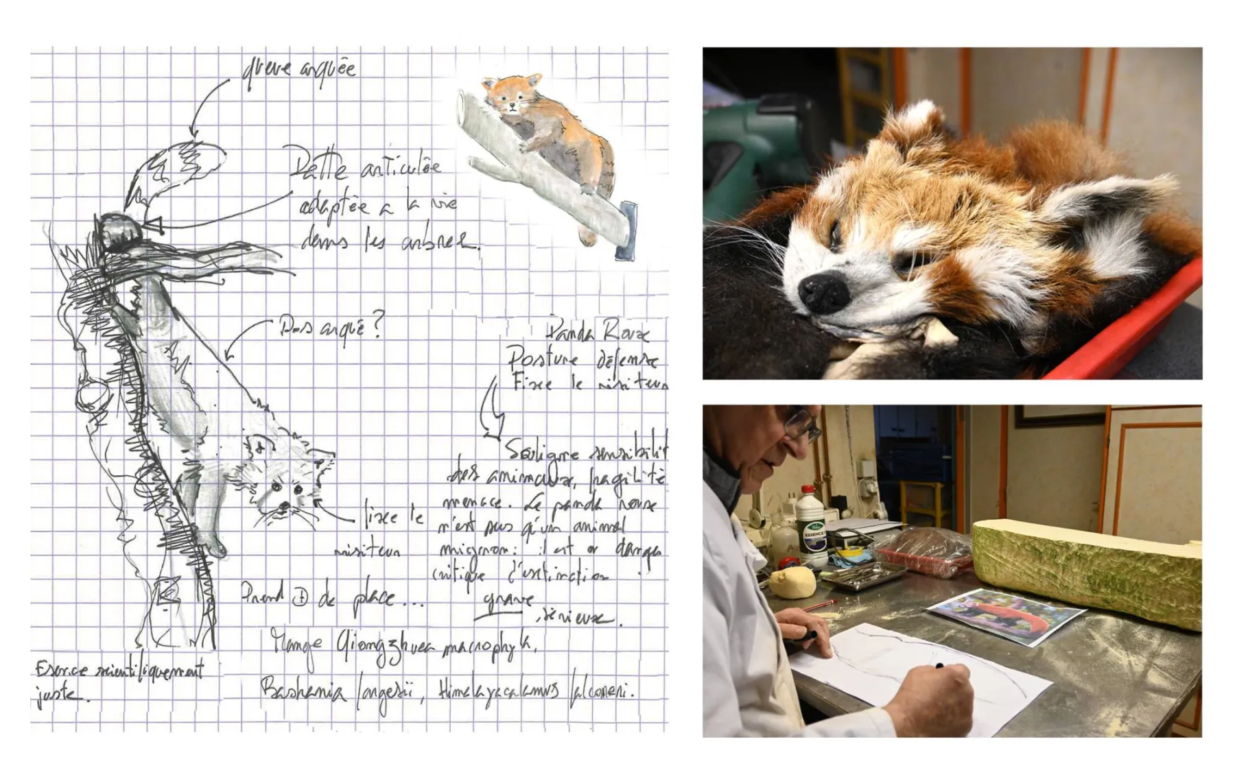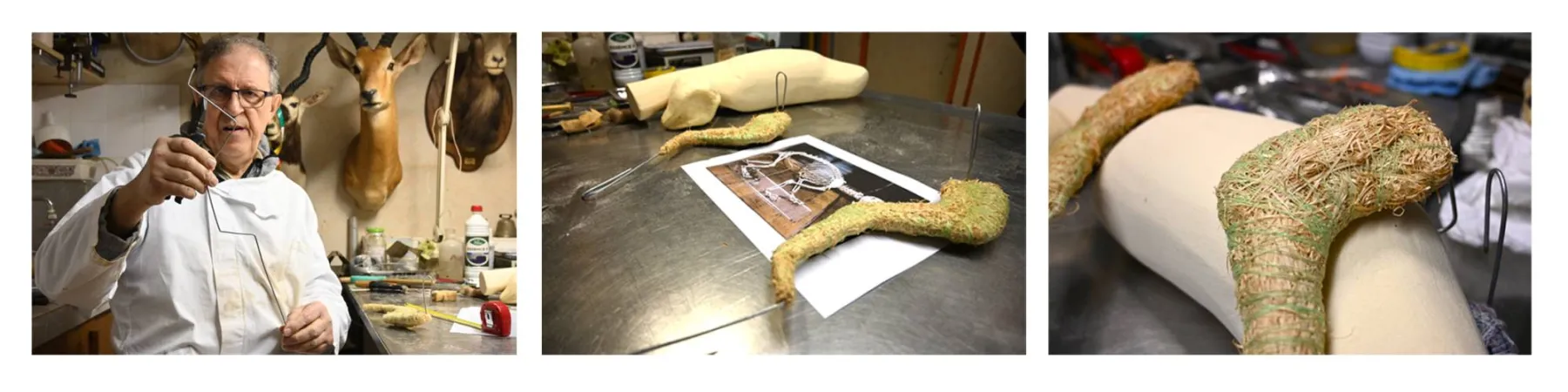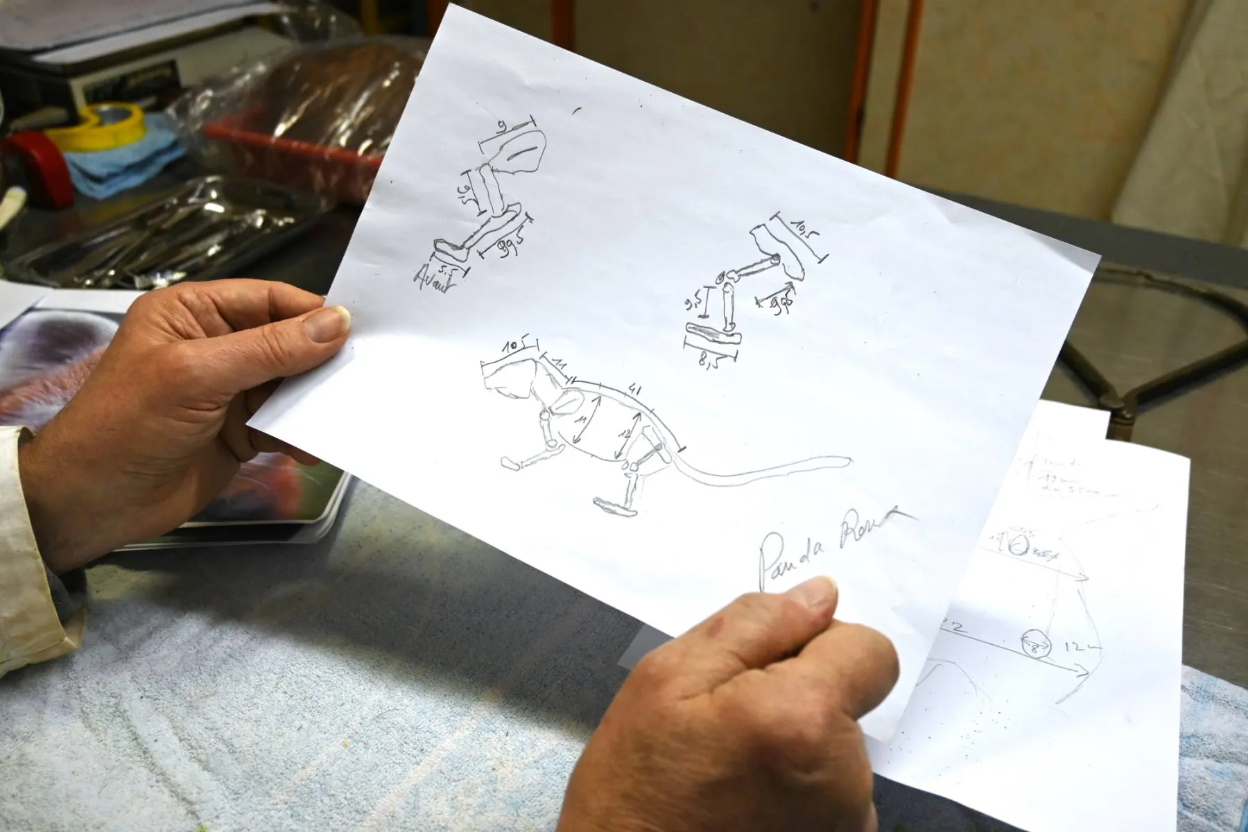 Ensuite viennent les mensurations. On mesure chaque partie du corps pour les reporter sur le futur mannequin qui accueillera la peau. Si nous ne disposons que d’une peau, on peut par exemple à partir du crâne, recalculer la longueur du corps, du bassin, du fémur, ou encore du tibia. Il existe des formules prédéfinies : la longueur du tibia-péroné est égale à une fois et demie la longueur du tarse ou encore le fémur est exactement égal la longueur du tibia-péroné… Ces mesures restent approximatives, il faut parfois les ajuster en fonction de l’individu. Comme pour les êtres humains, les spécimens sont tous différents. On peut donc avoir des animaux avec des grandes pattes, d’autres avec des pattes plus courtes… La taxidermie, c’est du sur-mesure !