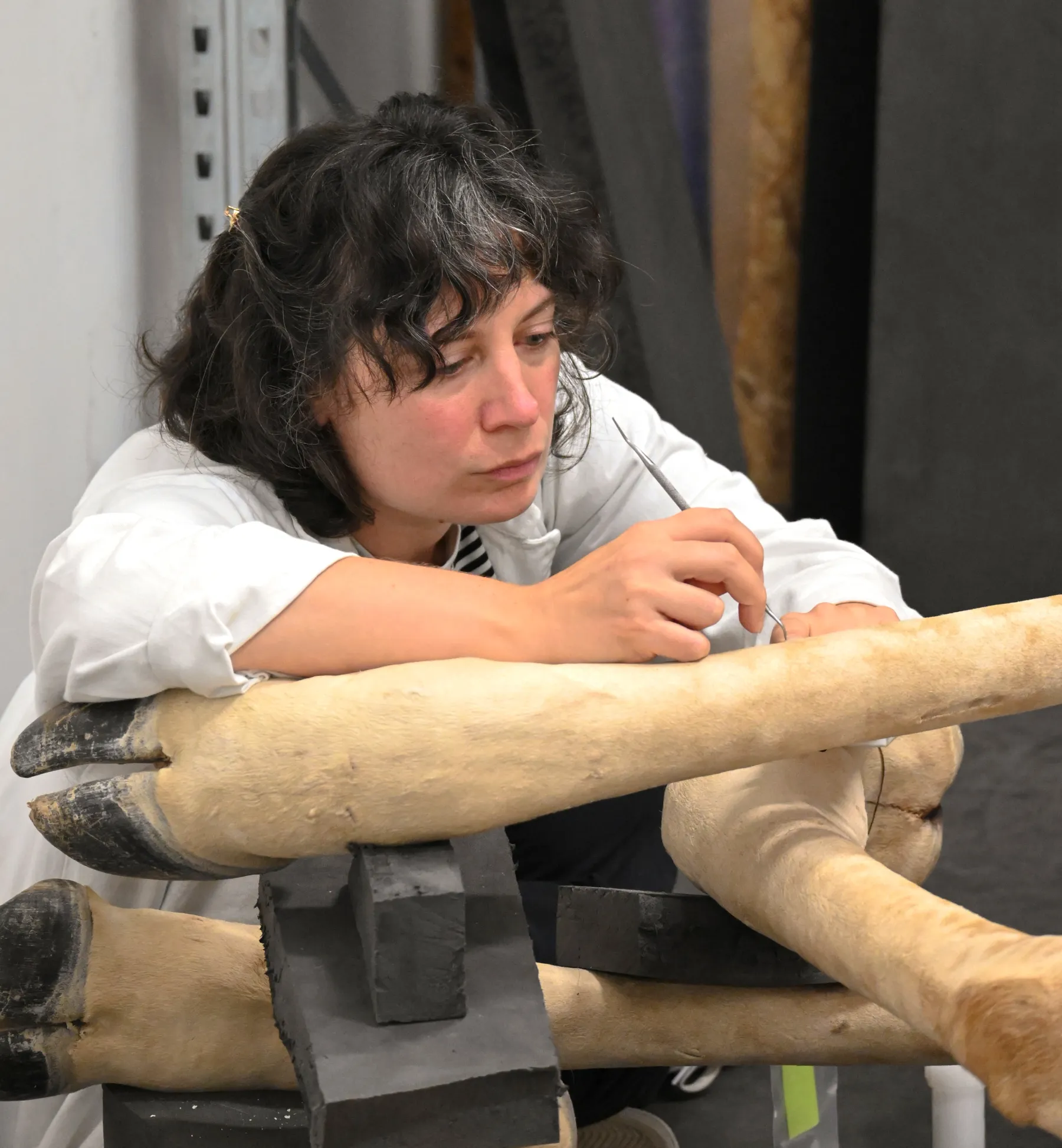 M-B : C’est un spécimen récent, naturalisé par Yves Gaumetou il y a une dizaine d’années. Elle est magnifique, surtout grâce à sa posture originale : elle simule la course et n’a pas de socle, ce qui permet de la suspendre au mur. Mais cette particularité pose aussi des contraintes pour la conservation. Au départ, elle n’avait besoin que d’un simple dépoussiérage, puisqu’elle est récente et en très bon état. Mais elle a été stockée dans une caisse à claire-voie qui n’était pas adaptée à son poids. Les fixations ont cédé, elle s’est affaissée et a frotté contre la caisse… Résultat : quelques dommages, comme la perte de poils, des frottements et des usures mineures. Rien de grave, heureusement, elle reste superbe.