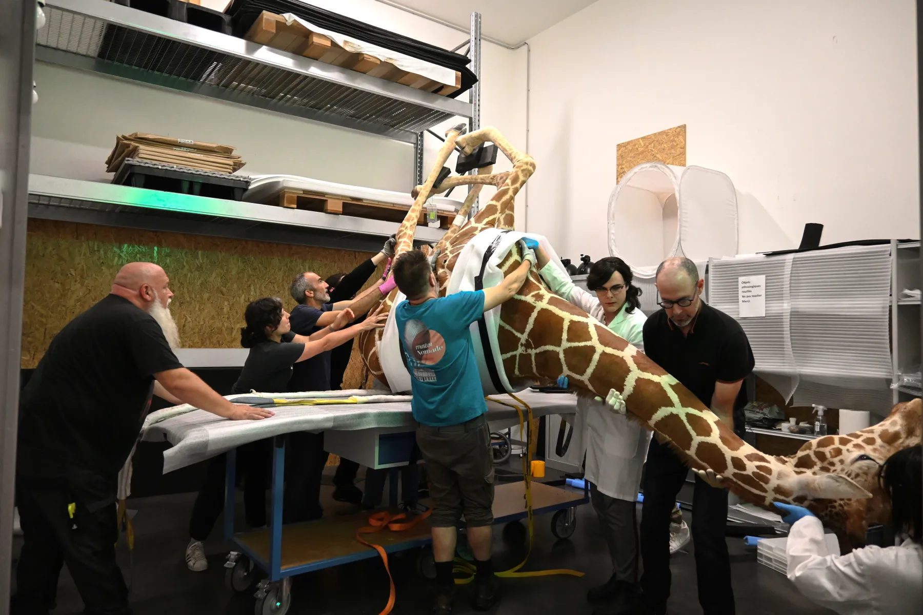 Dans le cas de la girafe, il y a le style très particulier d’Yves Gaumetou. C’est un taxidermiste mais aussi un artiste contemporain. Il conçoit des postures très audacieuses, avec des équilibres étonnants. Ce qui m’a bluffée, c’est que cette girafe tient grâce à seulement deux points de fixation. C’est presque un miracle, vu la masse du spécimen — pas tout à fait 300 kilos, mais quand même. C’est d’une virtuosité incroyable. Je n’avais jamais vu ça.