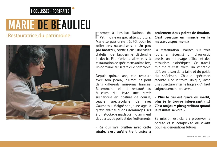 Marie de Beaulieu : Je suis restauratrice du patrimoine, spécialisée dans les collections d’histoire naturelle, notamment les spécimens naturalisés mais aussi les collections en fluide. J’ai obtenu le diplôme de restaurateur du patrimoine à l’Institut National du Patrimoine, une école d’État rattachée au ministère de la Culture, où la formation dure cinq ans. Ma spécialité était la sculpture — car il n’existe pas, en France, de filière dédiée à l’histoire naturelle. J’ai donc développé cette compétence en parallèle, grâce à mes stages et aux expériences que j’ai pu avoir dans des muséums.