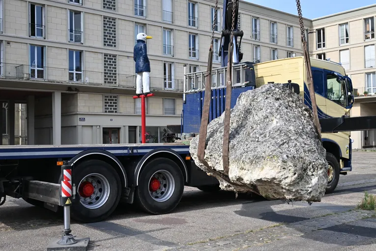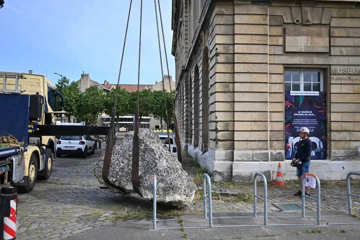 Installé depuis 15 ans à l’entrée du Muséum, un bloc de craie de 5 tonnes, témoin de l’exposition « Regards, la Hève et la Dent », a récemment été déplacé pour laisser place aux travaux.