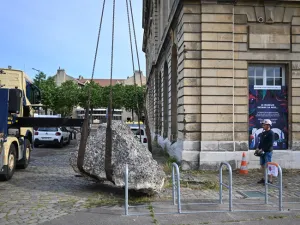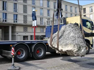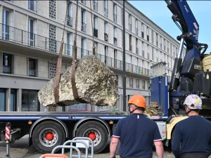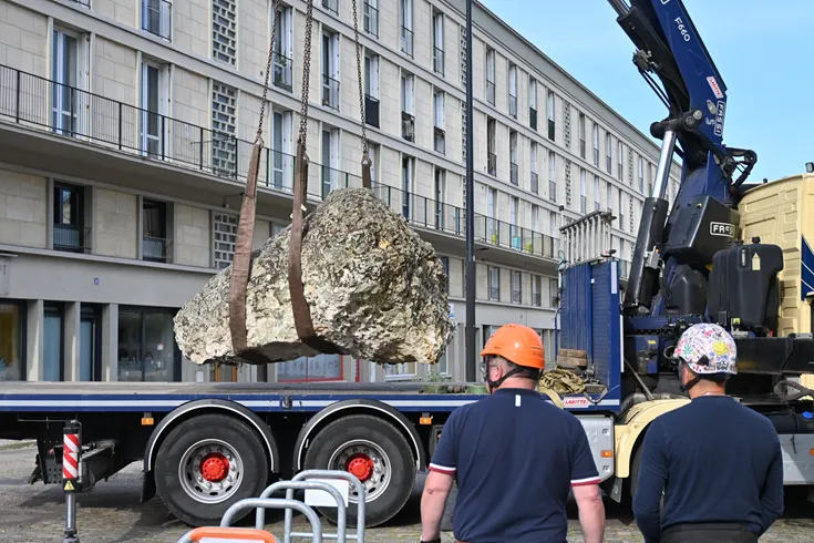 Déménagement du bloc de calcaire