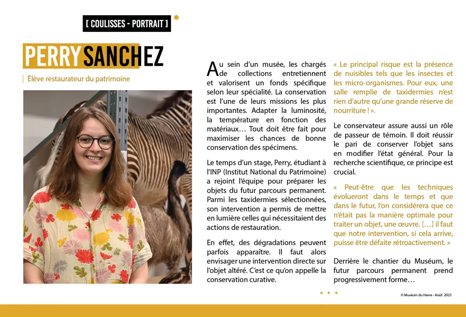 P.S. : Bonjour ! Je suis en formation à l’Institut National du Patrimoine pour devenir conservateur-restaurateur. J’interviens actuellement au Muséum du Havre, dans le cadre d’un stage, pour préparer le futur parcours scénographique.