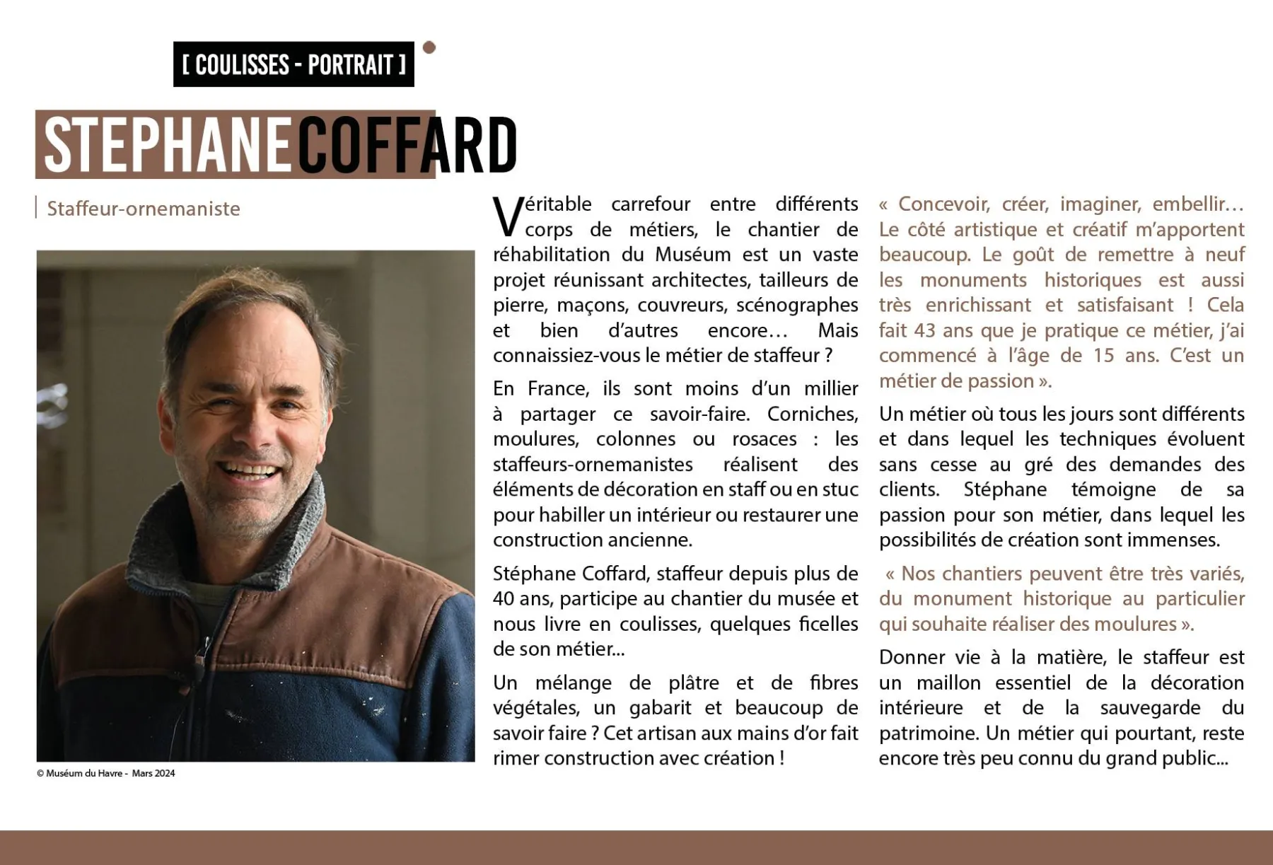 Stéphane Coffard, staffeur depuis plus de 40 ans, participe au chantier de réhabilitation du Muséum et nous livre quelques ficelles de son métier. « Concevoir, créer, imaginer, embellir… Le côté artistique et créatif m’apportent beaucoup. Le goût de remettre à neuf les monuments historiques est aussi très enrichissant et satisfaisant ! Cela fait 43 ans que je pratique ce métier, j’ai commencé à l’âge de 15 ans. C’est un métier de passion. »