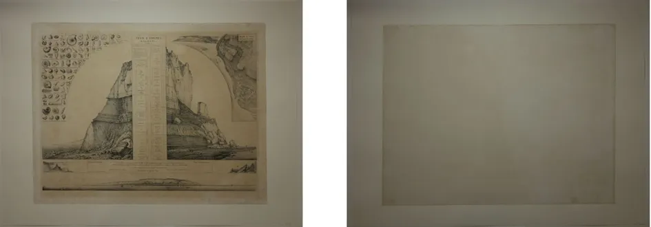 Charles A. Lesueur utilisera lui aussi ce procédé en 1842 à l’occasion de la réalisation du dessin « Vues et coupes du Cap de la Hève ». Initialement, l’objectif de l’œuvre était d’alerter les pouvoirs publics sur la composition géologique de la falaise, un éboulement récent ayant eu lieu aux abords de Sainte-Adresse (1841). Pour autant, cette œuvre connaîtra un plus fort retentissement dans le monde scientifique suite à sa présentation en 1844 devant l’Académie des sciences.Dans ce dessin, le peintre produit une synthèse très complète et instructive du Cap de la Hève.