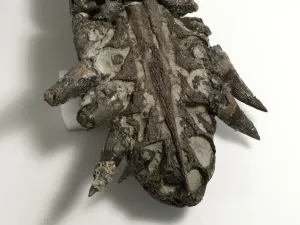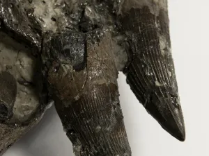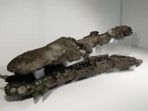 Le crâne d’1m30 de long, aplati par la fossilisation, est presque complet avec sa mâchoire inférieure. Il s’agit des ossements d’un pliosaure (du grec plio « nageoire » et sauros « lézard ») qui vivait dans la mer kimmeridgienne, il y a 145 millions d’années.