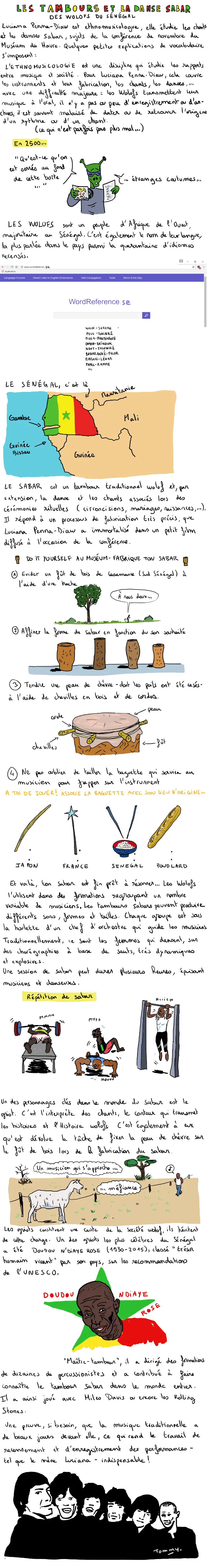 Luciana Penna-Diaw était l'invitée des Curieux mardis du Muséum pour une conférence sur les tambours et la danse sabar des Wolofs du Sénégal. Une occasion de découvrir les étapes de fabrication des tambours sabar ainsi que les danses réalisées par les femmes, ceci à travers un film documentaire réalisé par Luciana Penna-Diaw lors de ses expéditions au pays. Tommy Dessine était présent et vous livre comme à son habitude un résumé illustré juste et drôle.